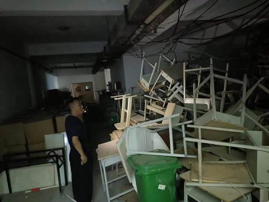 存放大量书籍、文献资料、座椅板凳,系因图书馆拆迁临时征用场地存放以上物品,新图书馆即将建成,届时堆放的易燃物品将及时挪走,已加强日常消防安全检查。