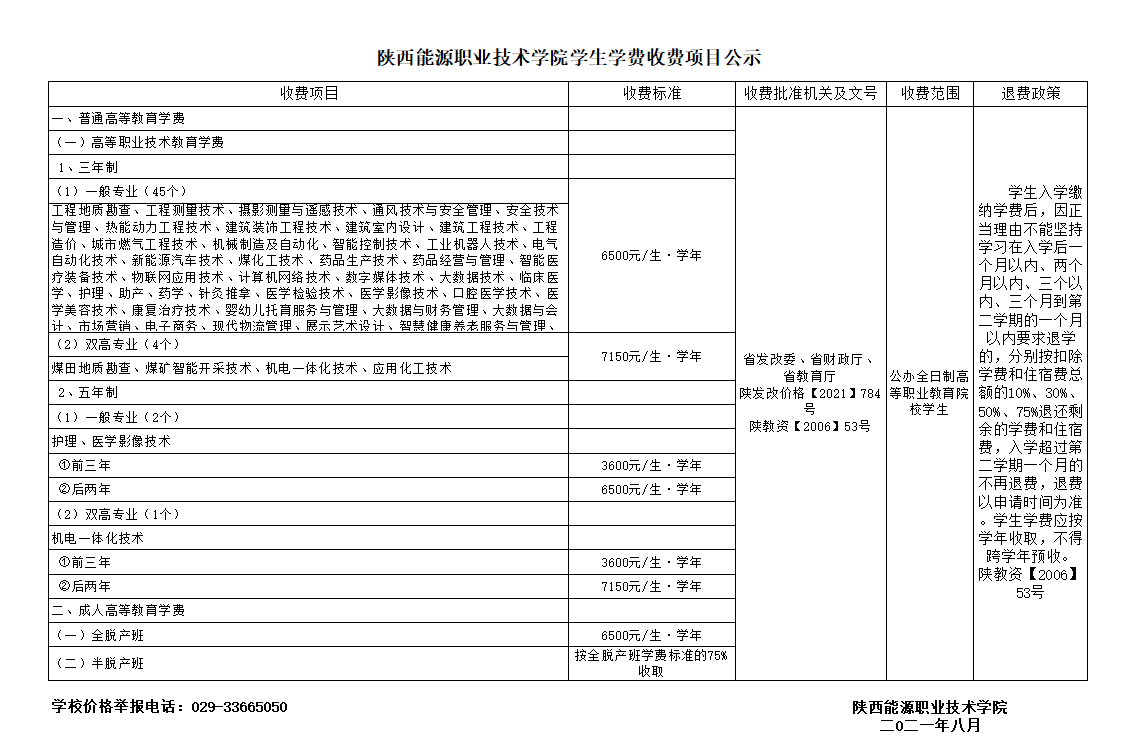 陕西能源职业技术学院学生学费收费项目公示