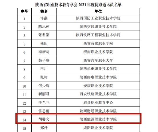 11月22日,陕西省职业技术教育学会发布《关于表彰2021年度先进二级委员会、先进工作者、优秀通讯员、优秀联络员的决定》(陕职学﹝2021﹞113号)文件,我校党政办宋溪玺、宣传部胡馨文分别获“优秀联络员”、“优秀信息员”荣誉称号。