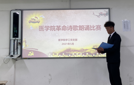 为庆祝中国共产党成立100周年,宣传党的丰功伟绩和继承党的优良传统,加强学生党员的爱国主义热情,弘扬民族精神,医学院学工党支部以“忆党史、铭党恩、强党性、促党建、正党风”为主题,开展了党史诗歌朗诵比赛。