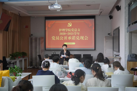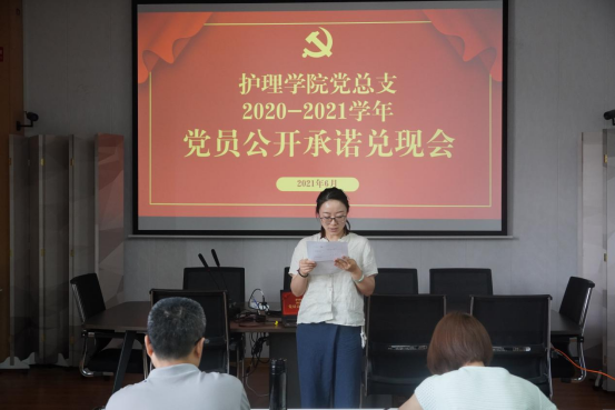 最后,党员教师为一学年前的党员公开承诺进行履职践诺总结,护理学院教工党支部教师代表俞菲、学工党支部雷东强老师公开践诺,总结一学年来党员承诺完成的情况。通过践诺活动,护理学院党员教师在坚守初心中践初心,做到言必行、诺必践,引导大家不忘初心,勇于担当,为平稳有序推进学校建设再立新功。