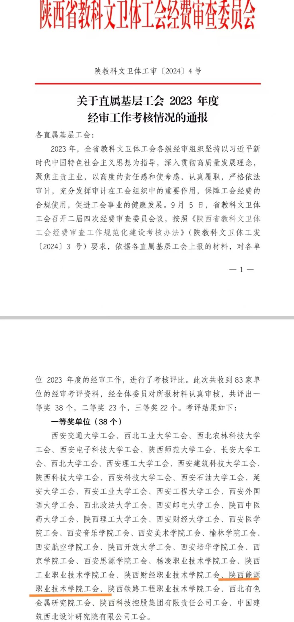 根据陕教科文卫体工审【2024】4号《关于直属基层分会2023年度经审工作考核情况的通报》精神,我校工会经费审查工作成绩斐然,荣获省教科文卫体工会经审工作考核一等奖。