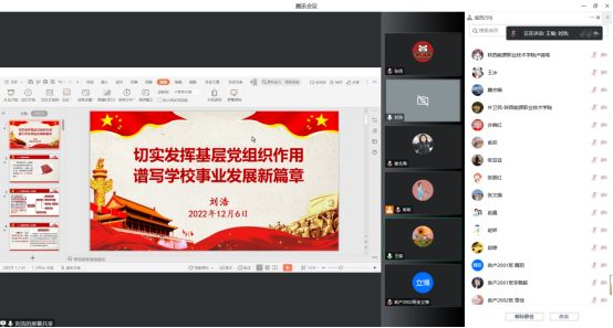 2022年12月6日,校党委委员、副校长刘浩为护理学院党员师生上了一堂内容丰富、内涵深刻的党课。党课通过腾讯会议进行,共有50余名党员师生参加。