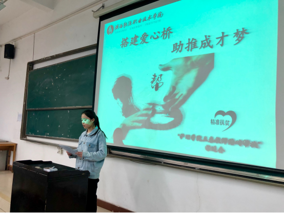 护理1713班张梦同学作为帮扶学生代表发言,来校一年的学习生活让她成长了许多,作为一名贫困家庭的学生感恩社会、学校对贫困学生的帮助,感谢帮扶教师在学习生活中无微不至的关心与鼓励,今后将更加努力学习回报社会。