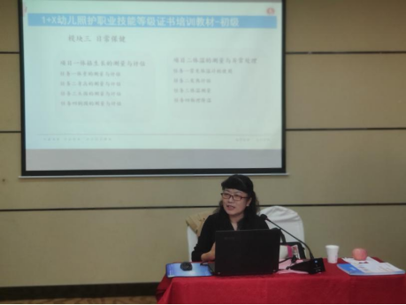 随后,我校教师代表、培训专家代表申婧发言。她表示,全社会对教育的重视已经延伸到了幼儿园甚至于托幼园阶段。幼儿是国家的未来,幼儿园阶段是幼儿生活、学习等习惯养成的重要阶段,而这些不仅仅依靠幼儿教师,更需要具有幼儿照护技能的专业人员参与,培养更多具有幼儿照护技能的专业人才是我们1+X证书制度工作的核心。希望通过此次培训提高参培教师的理论水平、实践操作能力与业务能力,指导学生获得1+X幼儿照护的等级证书,培养更多更优秀的幼儿照护人才。