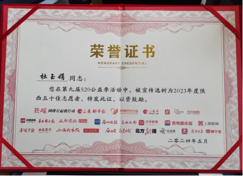 2023年,杜玉娟同志在陕西各个地市参与志愿服务,有着丰富的志愿服务经历,用自身正能量事迹,感染和带动身边的人,创新公益理念及形式。在青少年校园安全教育和社区防灾减灾领域做出突出贡献。
