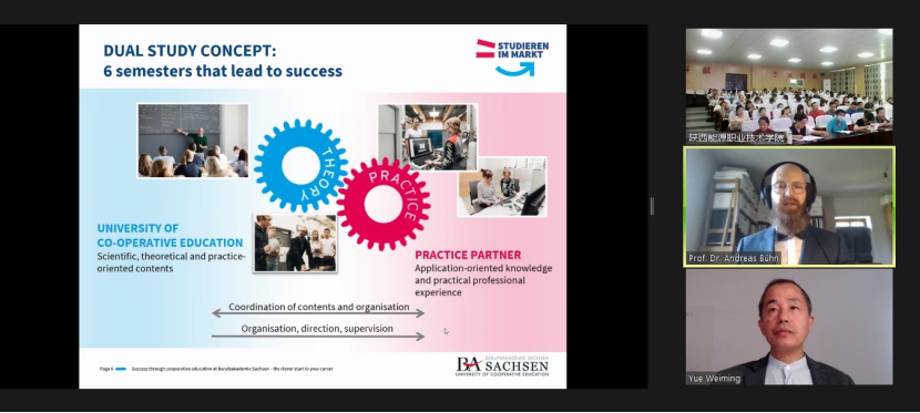 此次活动由德国BSK国际教育机构举办,通过ZOOM全球高清云视频会议软件在线进行,邀请德国萨克森双元制大学公共管理系主任安德烈亚斯·布恩教授主讲,岳维明副教授担任翻译。安德烈亚斯·布恩教授结合萨克森双元制大学办学实际,从学生入学资格、办学制度、校企合作、人才培养、课程设置及实践教学等环节向与会人员分享了双元制大学的办学理念和实践,以及“1+X证书”在德国双元制大学中的制度和实践