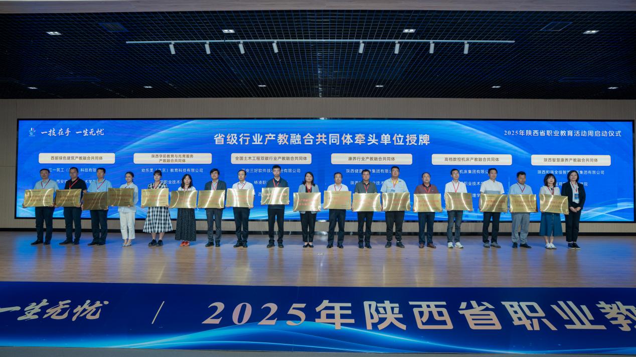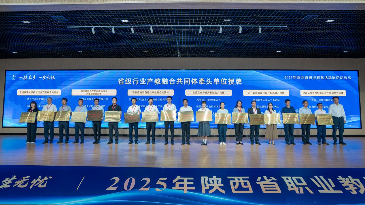 启动仪式上,中共陕西省委教育工委委员、省教育厅副厅长申雪峰出席启动仪式并讲话,陕西省政协副主席、陕西省中华职教社主任李忠民宣布2025年陕西省职业教育活动周启动。西安吉利汽车有限公司领导、职业院校代表、大国工匠及学生代表先后发言。省级10部门领导分别向35个省级行业产教融合共同体和29个市域产教联合体授牌。我校建设的煤炭行业产教融合共同体、康养行业产教融合共同体、食养食疗行业产教融合共同体、乡村医疗卫生行业产教融合共同体、咸阳绿能产教联合体、秦创原高端装备(矿山)人才产教联合体、渭南经开化工产教联合体各牵头单位代表上台接受授牌。会议期间,还启动了“匠心传承,寻找身边的能工巧匠”活动,并为2024年世界职业院校技能大赛金奖获奖项目颁奖。