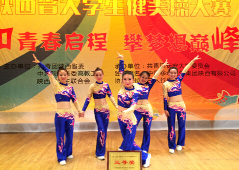 由共青团陕西省委、陕西省委高教工委、省学联主办,长安大学协办的第二十五届“校园之春”陕西省大学生文化艺术节暨陕西省大学生健美操大赛决赛于6月10日在长安大学渭水校区长安文化中心大礼堂隆重举行,来自全省的22所高校代表队经过初赛的选拔,共有西安理工大学、西北工业大学、长安大学等9支队伍参加最后的决赛,比赛当晚,各支参赛队伍凭借扎实的训练基础、精湛的技艺、饱满的热情和出色的表演征服了赛场裁判和所有观众,赢得阵阵掌声。最终西安体育学院、长安大学获得一等奖,我院喜获三等奖,是获奖的唯一一所高职院校。