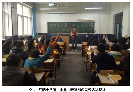 为了检验学习党的十八届六中全会精神的效果,按照系党总支的安排,2016年12月9日,经济管理系学生党支部举办了“党的十八届六中全会精神”知识竞答活动。我系64名入党积极分子和本支部四名教工党员参加活动。竞答活动中,一名教工党员与16名入党积极分子组成一个队。四个队共同竞答提出的问题。竞赛现场气氛活跃、最终蒋文老师代表队累计得分最高,获得优胜。