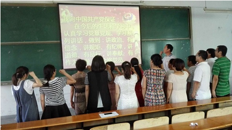 7月6日下午,基础部党支部在综合楼502举行主题党日活动----向党旗宣誓,做合格党员。