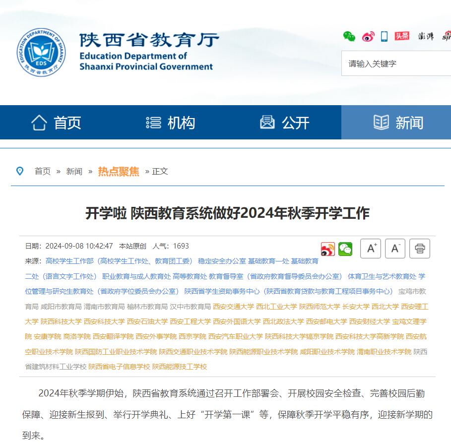 陕西省教育厅:开学啦 陕西教育系统做好2024年秋季开学工作