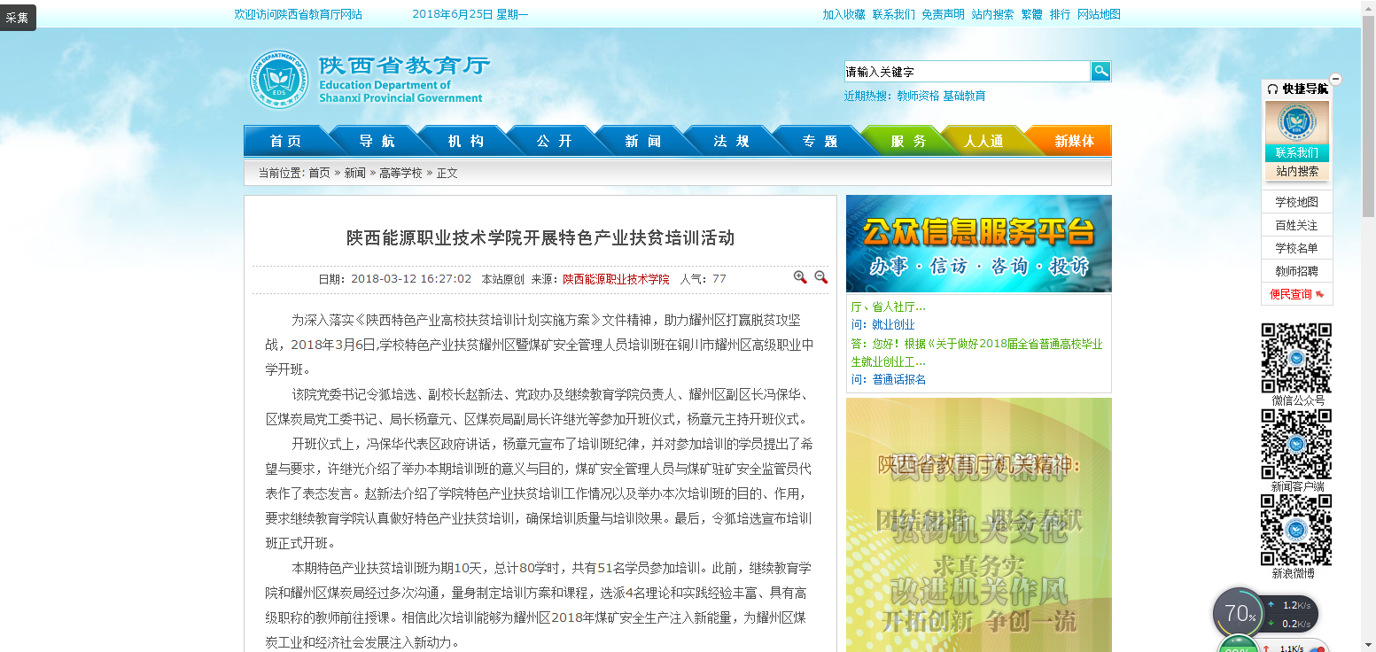 为深入落实《陕西特色产业高校扶贫培训计划实施方案》文件精神,助力耀州区打赢脱贫攻坚战,2018年3月6日,学校特色产业扶贫耀州区暨煤矿安全管理人员培训班在铜川市耀州区高级职业中学开班。