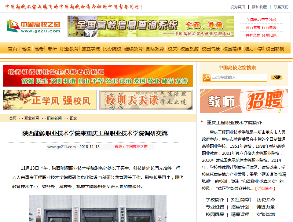 座谈会上,副校长吴再生对王买生处长、闫光准处长一行的到来表示热烈欢迎,并从历史沿革、办学规模、师资队伍、专业建设、校企合作、继续教育等方面对学校的基本情况进行介绍。随后,重庆工程职业技术学院现代教育技术中心陈光海主任、机械学院党总支韩治华书记、科技处孙国文科长分别分享了重庆工程职业技术学院信息化建设、一卡通建设、科研经费管理及科技成果转化等方面的措施和经验。闫光准处长对陕西能源职业技术学院的基本情况进行简单介绍,希望通过此次交流,学习建设经验,促进学校发展。(通讯员:颜琬璐 阙昌宇 刘晓丽 王琼)
