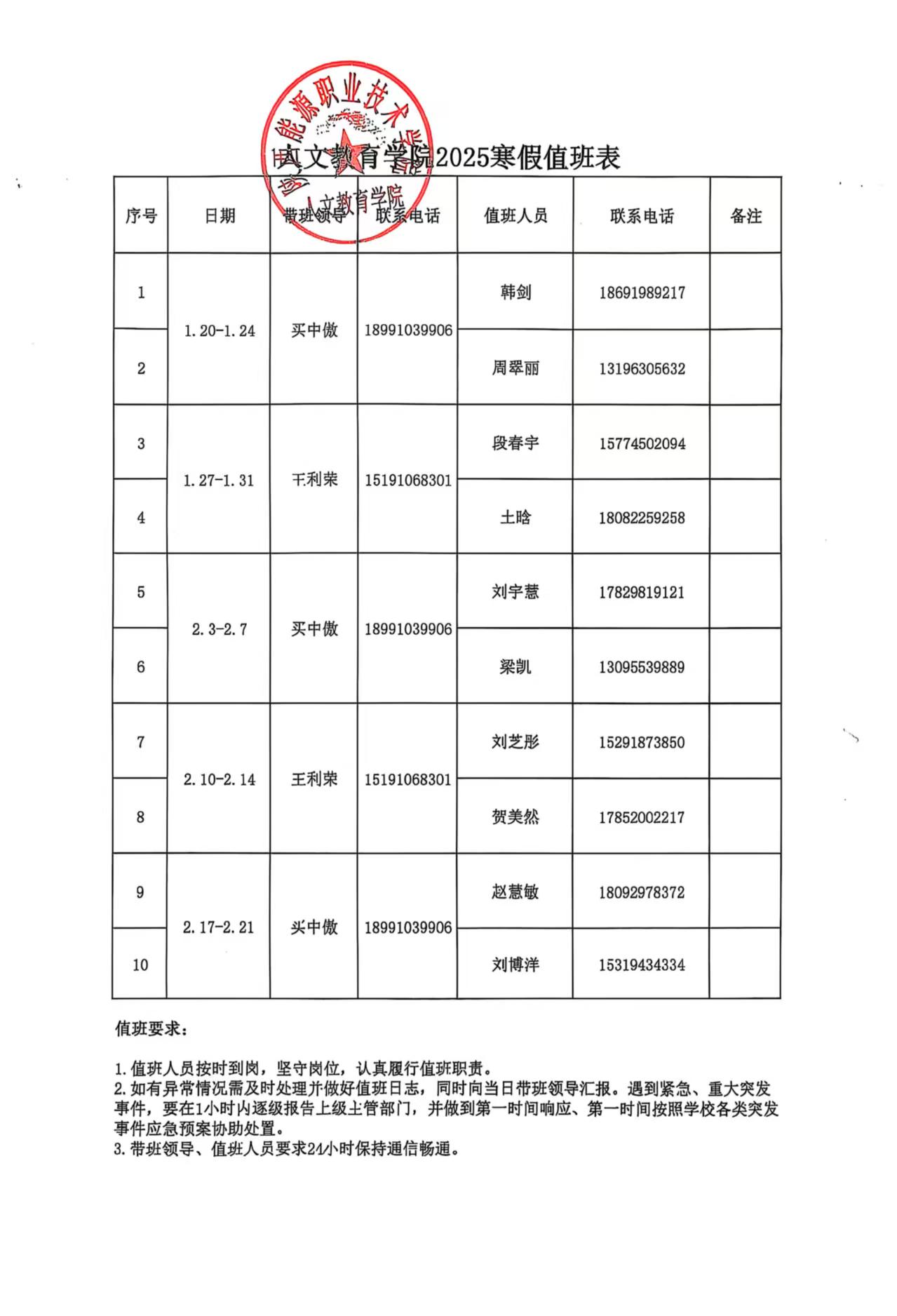 2.各二级部门坚持工休结合,做好寒假教职工轮休安排,完成好学校各项工作任务。教职工轮休从1月20日(星期一)开始,2月21日(星期五)结束,全校教职工2月22日(星期六)、2月23日(星期日)正常上班。