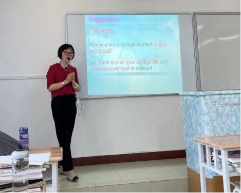 首先上场的是赵华老师,她通过讲解Going to college ,在谈论为什么要上大学的同时,教育学生爱校爱专业,学习工作有计划,做一个自信快乐的人。