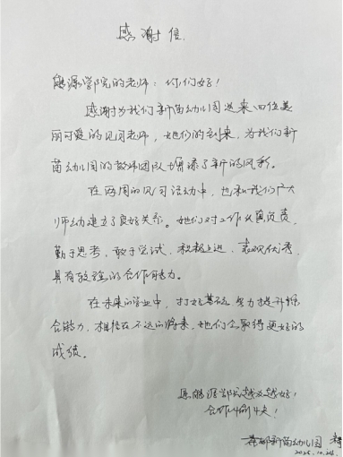 这封手写感谢信,纸短情长,它承载的不仅是园所的认可,更是对我校“以专业服务企业,以行动践行责任”理念的肯定。未来,我校将继续以这份信任为动力,持续发挥专业优势,推动教学成果向社会辐射,为区域托育服务事业高质量发展持续贡献学校力量。