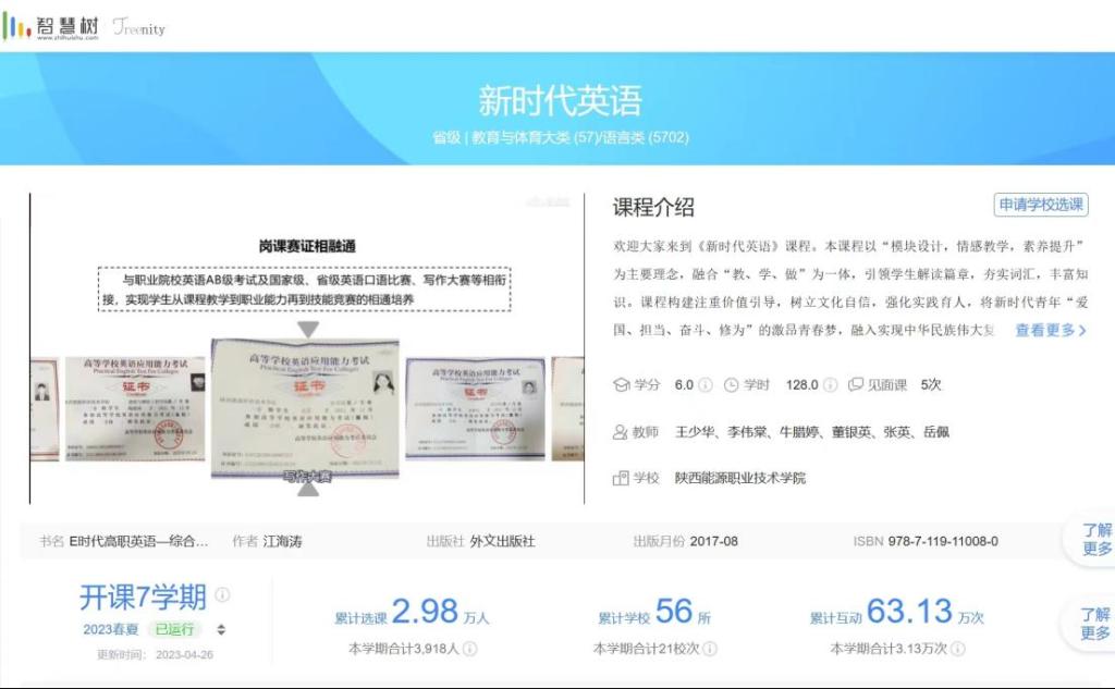 《新时代英语》课程于2020年12月开始在智慧树网平台运行,已服务6个学期。从课程受益面来看,目前除供本校学生外,新疆工程学院、青岛工学院、厦门理工学院、贵州大学、杨凌职业技术学院、咸阳师范学院、郑州黄河护理职业学院等56所学校均有学生选修本课程。