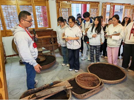 之后,师生们参观了“益生源记”仿古作坊,欣赏“茯茶号子表演”并体验非遗筑茶技艺。