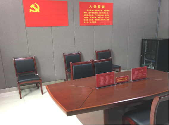 谈话室设在办公楼一层,室内墙壁上,一面是鲜红的党旗和入党誓词,另一面是“知敬畏 存戒惧 守底线”等警示语,谈话桌上明示《谈话规范》和《谈话纪律》。谈话室严格按标准建设,设置安全防护,安装全程同步录音和无死角的录像设备,具备全程实时同步录像、录音、存储、检索等功能。