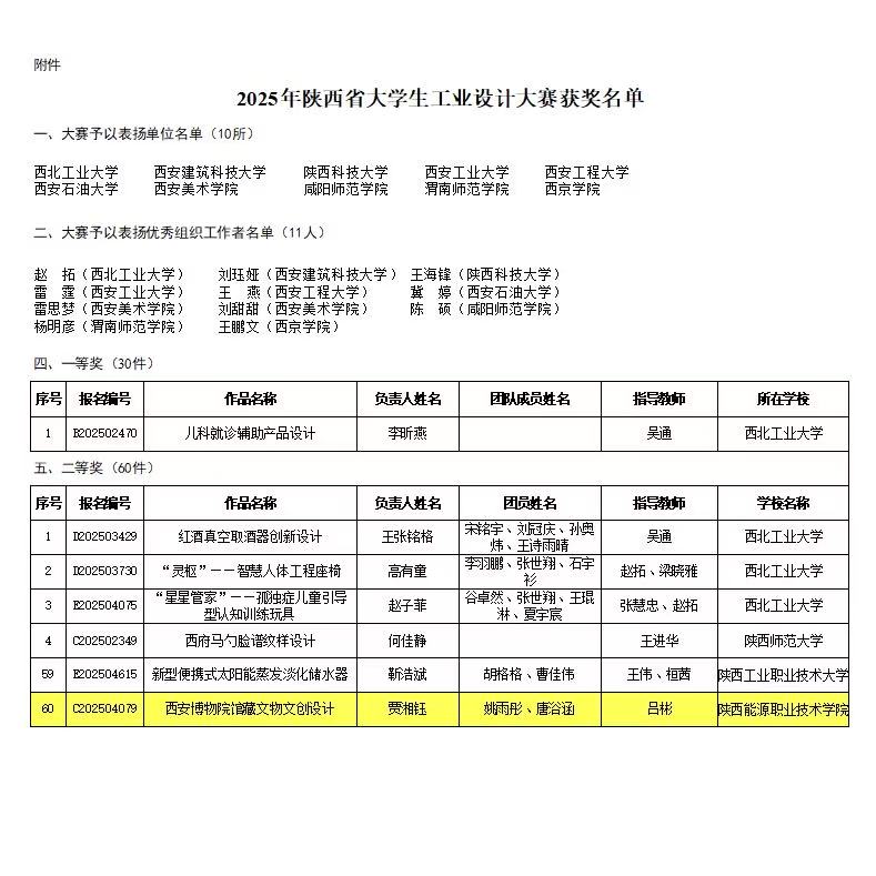 近日,2025年陕西省大学生工业设计大赛获奖名单正式公布。由我校建筑测绘学院吕彬老师指导,贾湘钰、姚雨彤、唐浴涵同学共同完成的作品《西安博物院馆藏文物文创设计》,斩获大赛二等奖。这一佳绩彰显了我校学子扎实的专业功底与创新实践能力。