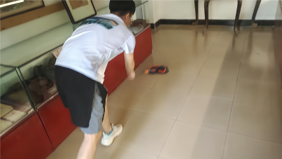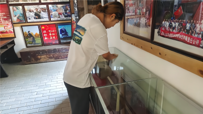 随后,实践团带着清洁工具和防暑物资回到正在扩建的肖何庙村红色记忆博物馆,对各个展厅环境卫生进行打扫并对魏德君馆长和现场施工人员送上防暑物资。因为扩建工程,不少展厅地面和展柜上落下了不少灰尘,细心的实践队员在前一天参观后就萌生了义务卫生劳动的想法。40度的高温下,队员们不惧炎热和辛苦,用自己勤劳的双手和汗水,在红色阵地上书写着属于自己的青春色彩。