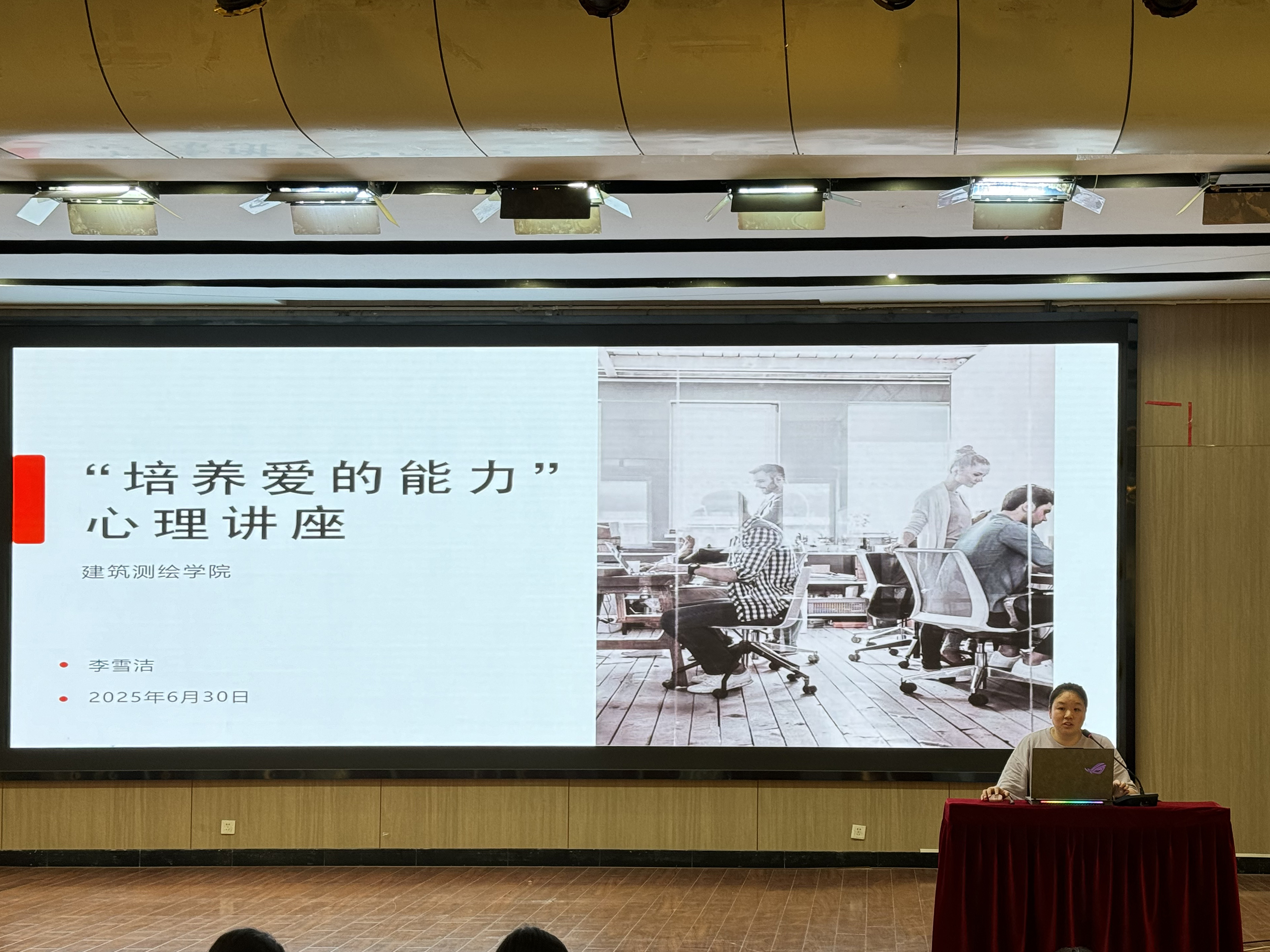 为深入贯彻立德树人根本任务,扎实推进大学生心理健康教育工作,引导学生树立正确的恋爱观、人际观,提升建立与维护培养爱的能力,建筑测绘学院辅导员李雪洁于2025年6月30日在实训楼六楼报告厅举办了以 “培养爱的能力”为主题的心理讲座。本次讲座面向全校师生展开,吸引了420余名学生积极参与。