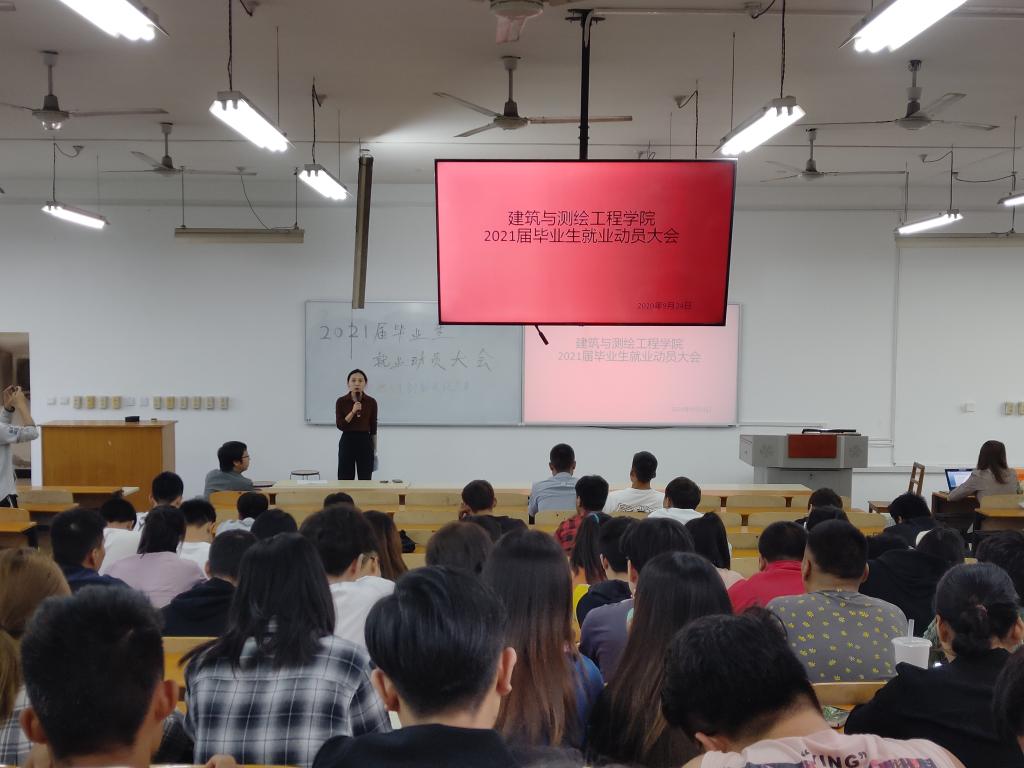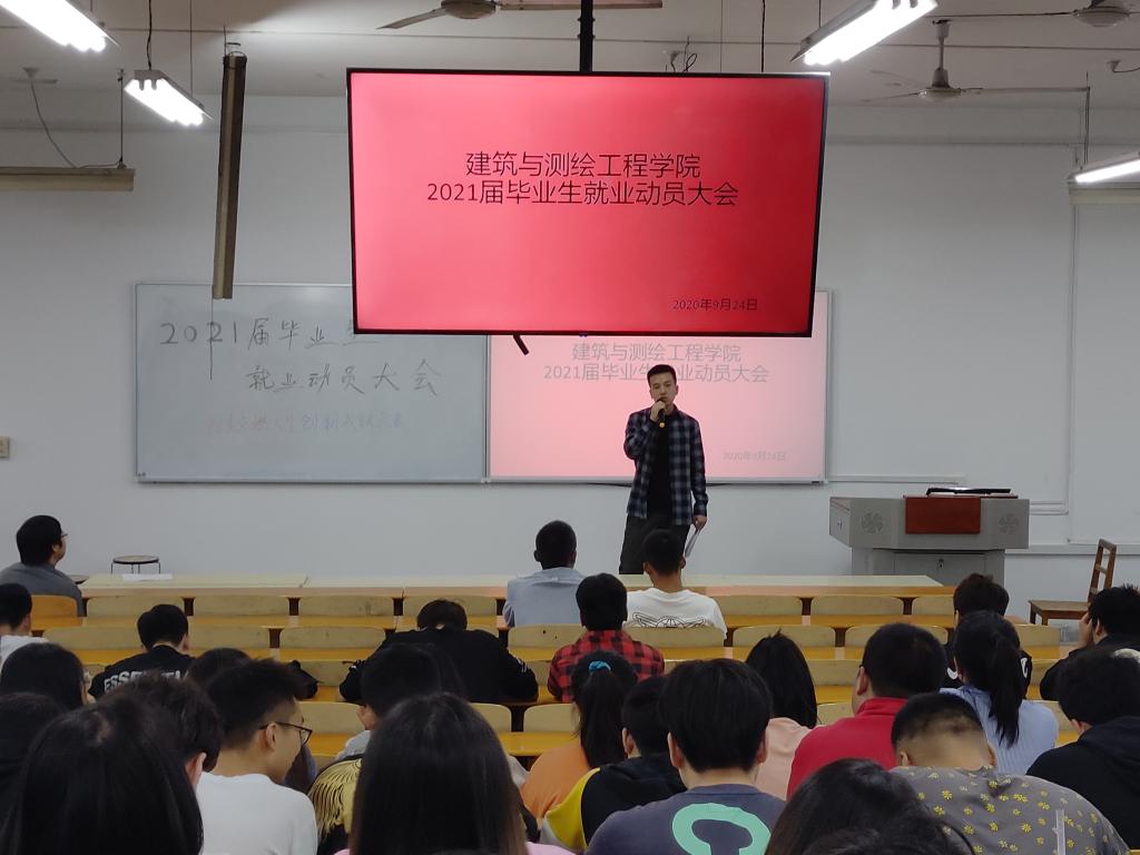 9月24日下午,建筑与测绘工程学院在综合楼502教室召开2021届毕业生就业动员会。参会人员有学院党总支书记买中傲,学工办主任杨旸,辅导员季小光老师及全体2021届毕业生。