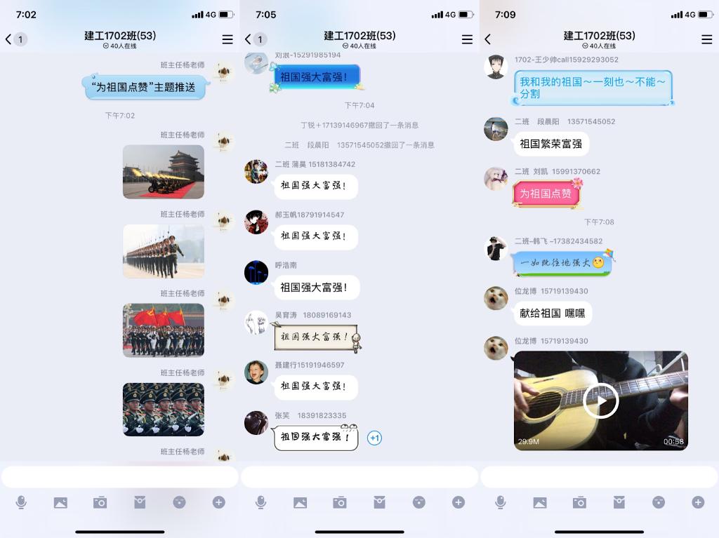 国庆之后各班级组织召开爱国主题班会,形式多样主题新颖,供热1701班以《壮丽70年》为主题为同学们播放祖国发展进程视频;建工1702班围绕“为祖国点赞”主题在班级群内推送祖国精彩图片,同学们纷纷点赞,吉他爱好者位龙博上传《我和我的祖国》弹奏视频为祖国献唱表达对祖国的热爱;建装1801班、展示1701班、燃气1901班,建管1701班等各班级分别围绕《奋进70年 辉煌70年》、《喜迎国庆 展望未来》、《壮丽70年,奋进新时代》主题开展班会;建工1901班召开“我看新中国70周年新成就”座谈会。其他班级也都通过召开“庆国庆 爱祖国”主题班会、组织学生观看爱国主义题材文字、影像资料,讴歌新中国成立70年特别是改革开放40年来伟大祖国所取得的辉煌成就,为祖国母亲的70华诞献上了诚挚的祝福。
