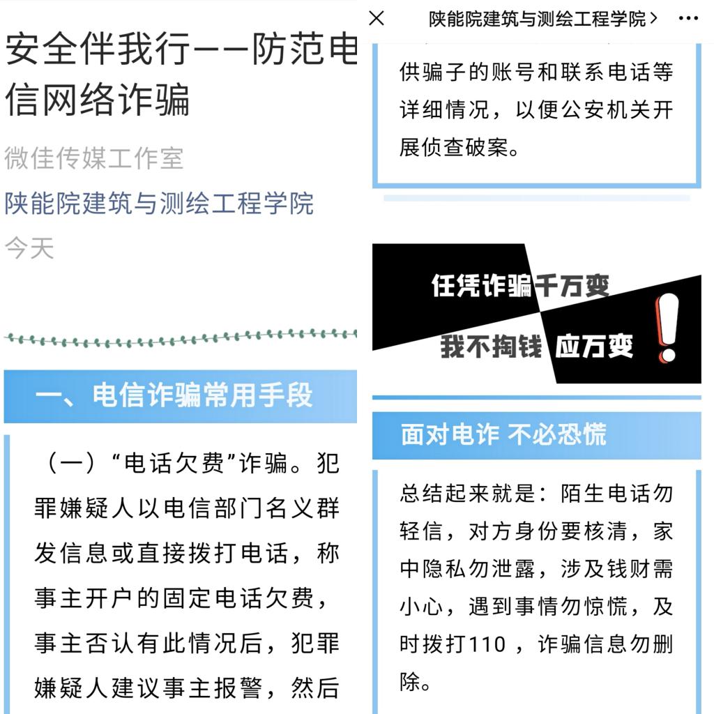 学院以预防网络电信诈骗安全教育为重点,结合疫情期间新型诈骗案例,通过QQ群、微信公众号等平台推送预防网络电信诈骗知识,加强宣传教育,提高学生安全防范意识。