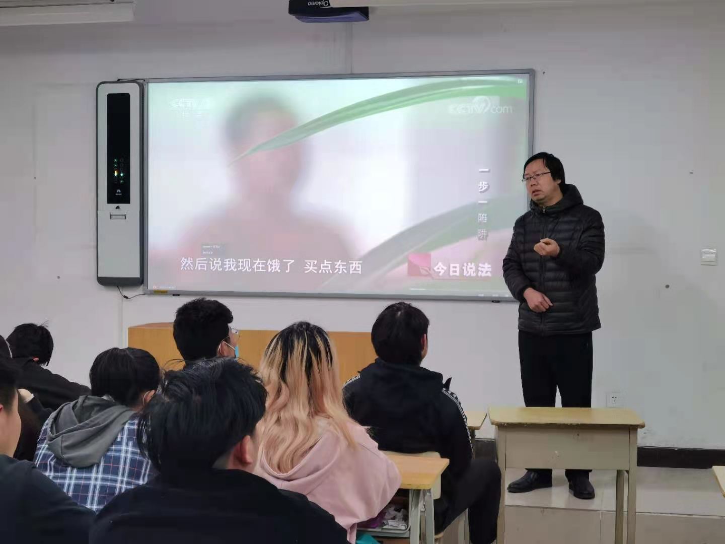 主题班会通过线上、线下的方式在各班有序开展。各班首先播放了《今日说法》中的现实案例,接着班主任告诉同学们电信网络诈骗主要是犯罪分子编造虚假信息,诱使受害人打款或转账,所以切勿轻信来源不明的信息。