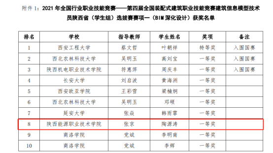 2021年全国行业职业技能竞赛--第四届全国装配式建筑职业技能竞赛(学生组)陕西省选拔赛于2021年10月22日举行。来自全省28所本科、高职院校同场竞赛, 265名选手进行了激烈角逐。结果于10月28日公布。我院建筑与测绘工程学院学生陶源涛同学在BIM深化设计赛项中荣获一等奖、在BIM项目管理赛项取得二等奖;郑一铭同学在BIM深化设计赛项中获得三等奖。