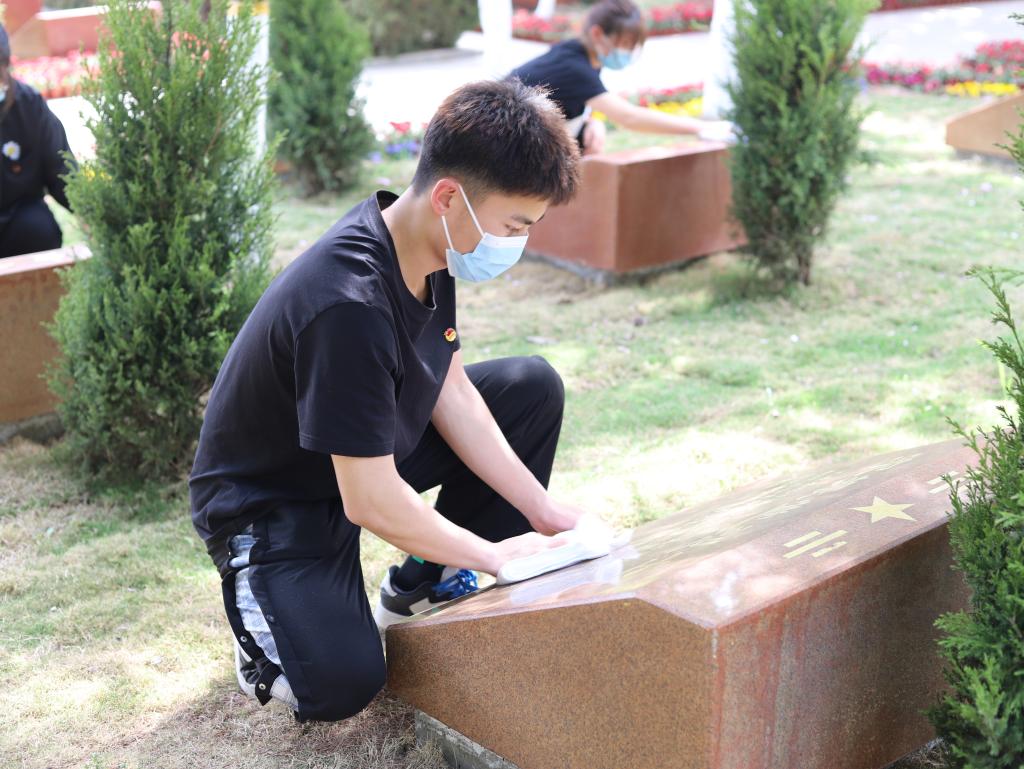 随后,祭扫活动开始,全体师生来到和平广场静默瞻仰,并在和平鸽碑前逐一献花;5名师生代表擦拭烈士墓碑并行三鞠躬礼。