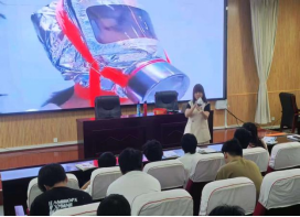 活动开始,贺静静通过播放近年来典型火灾事故案例视频,以触目惊心的画面剖析火灾危害,引发师生对消防安全的深刻思考。并结合“全国消防日”的设立背景与意义,系统讲解了建筑消防系统的构成与运行原理,涵盖自动报警装置、喷淋系统及逃生通道设计等关键内容,并现场演示了防毒面罩的正确佩戴方法及灭火器的“提、拔、握、压”四步操作技巧。随后针对校园环境特点,重点分析了实验室用电、宿舍违规电器、食堂燃气使用等常见火灾隐患,并提出“人走断电”“定期排查线路”“规范使用消防器材”等具体预防措施。