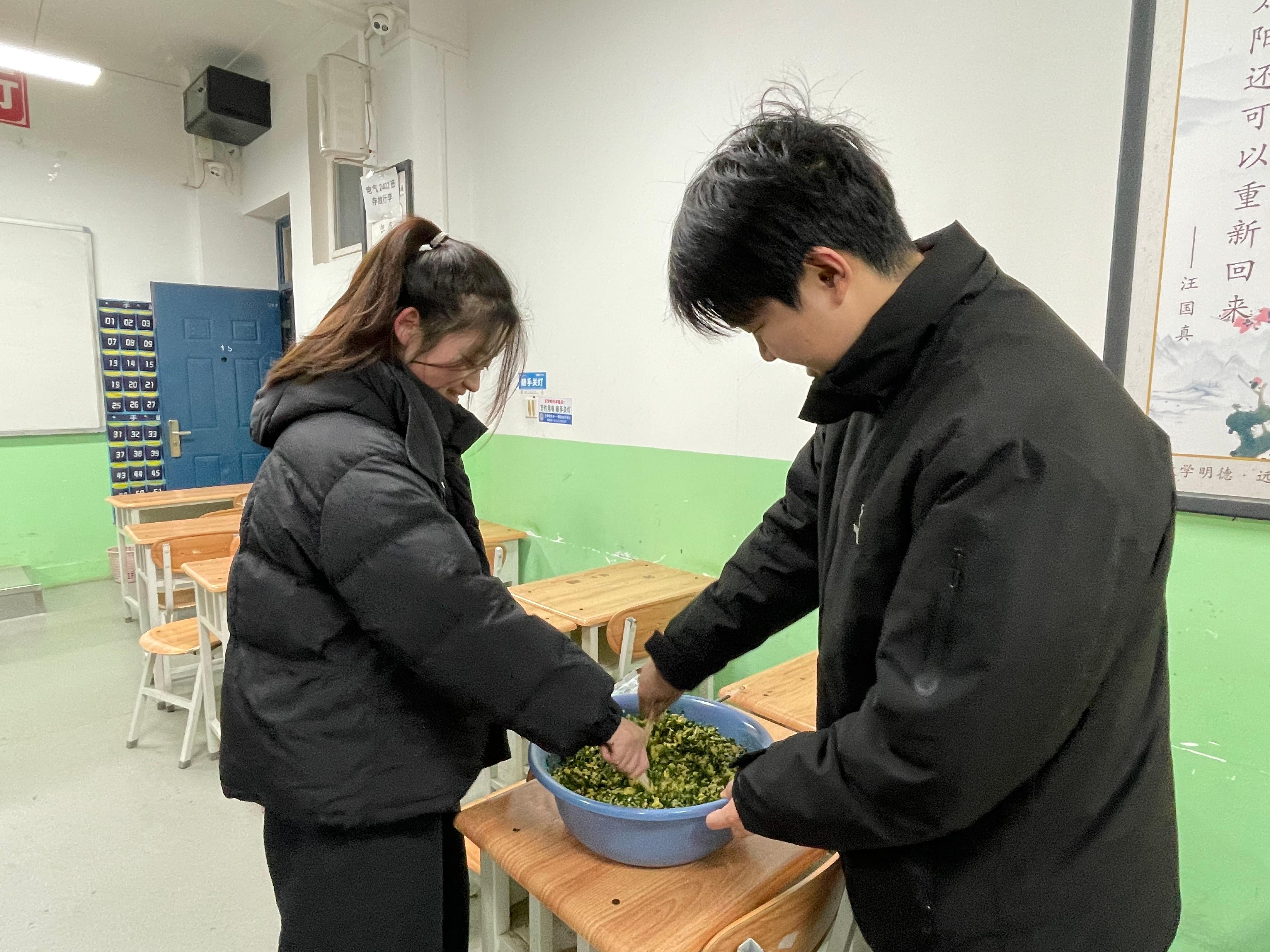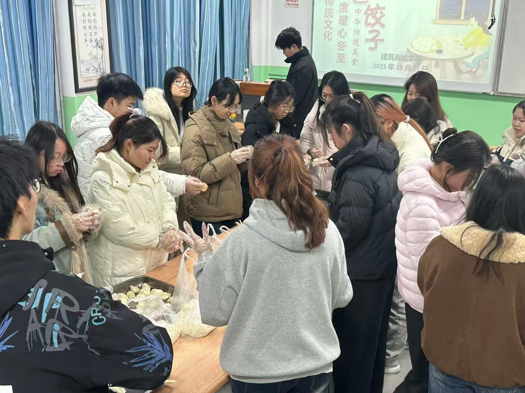 岁寒冬至至,情暖饺子香。为传承中华优秀传统文化,丰富校园生活,让远离家乡的同学们在寒冬中感受到集体的温暖与关怀,2025年12月21日,建筑测绘学院于教学楼115教室精心组织了“弘扬传统文化 共度暖心冬至”主题包饺子活动。数十名同学欢聚一堂,以饺为媒,共庆冬至佳节,现场洋溢着热闹温馨的节日氛围。