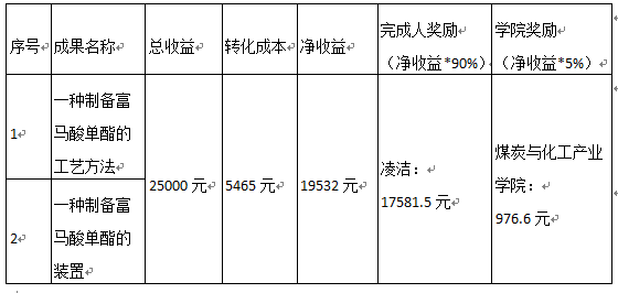 学校将“一种制备富马酸单酯的工艺方法(ZL 2016 1 0385346.7)”和“一种制备富马酸单酯的装置(ZL 2016 2 0528936.6)”的专利权转让社会企业,根据《陕西省促进科技成果转化条例》和陕西省教育厅、科技厅、财政厅印发的《关于落实以增加知识价值为导向分配政策促进省属高校科技成果转移转化的实施意见》(陕教〔2017〕1号)、《陕西能源职业技术学院科技成果转移转化实施办法(试行)》(陕能院科〔2019〕5号)等相关规定,拟对专利权完成人及其所在学院进行奖励,现予以公示。