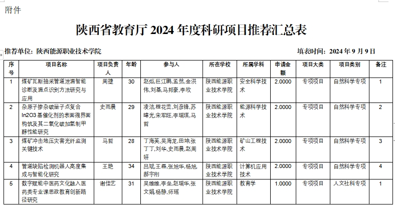 根据《陕西省教育厅科研计划项目管理办法》和《陕西省教育厅办公室关于组织申报2024年度科学研究计划项目的通知》要求,学校严格按照相关程序开展此项工作,经教师申报、各部门推荐、科研信息处及专家审查评议后,拟推荐《煤矿瓦斯抽采管道泄漏智能诊断及漏点识别方法研究与应用》等4项申报2024年度陕西省教育厅科学研究计划项目一般专项项目(自然科学类);拟推荐《数字赋能中医药文化融入医药类专业课思政教育创新路径研究》等2项申报2024年度陕西省教育厅科学研究计划项目一般专项项目(人文社会科学类),并进行排序,拟推荐申报项目服务地方专项(产业化培育项目)2项,青年创新团队项目1项,重点项目(高校工程研究中心项目)2项,具体详见附件,公示5天(2024年9月4日——2024年9月8日)无异议。
