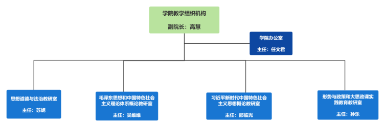 马院下设一个办公室和四个教研室。办公室主要负责制定学院思想政治理论课教学计划及教学、科研、师资队伍建设的组织实施等工作。四个教研室包括:《思想道德与法治》教研室、《毛泽东思想和中国特色社会主义理论体系概论》教研室、《习近平新时代中国特色社会主义思想概论》教研室、《形势与政策》和《“大思政课”实践教育》教研室。教研室主要负责思想政治理论课教学、课程建设、教科研等工作。
