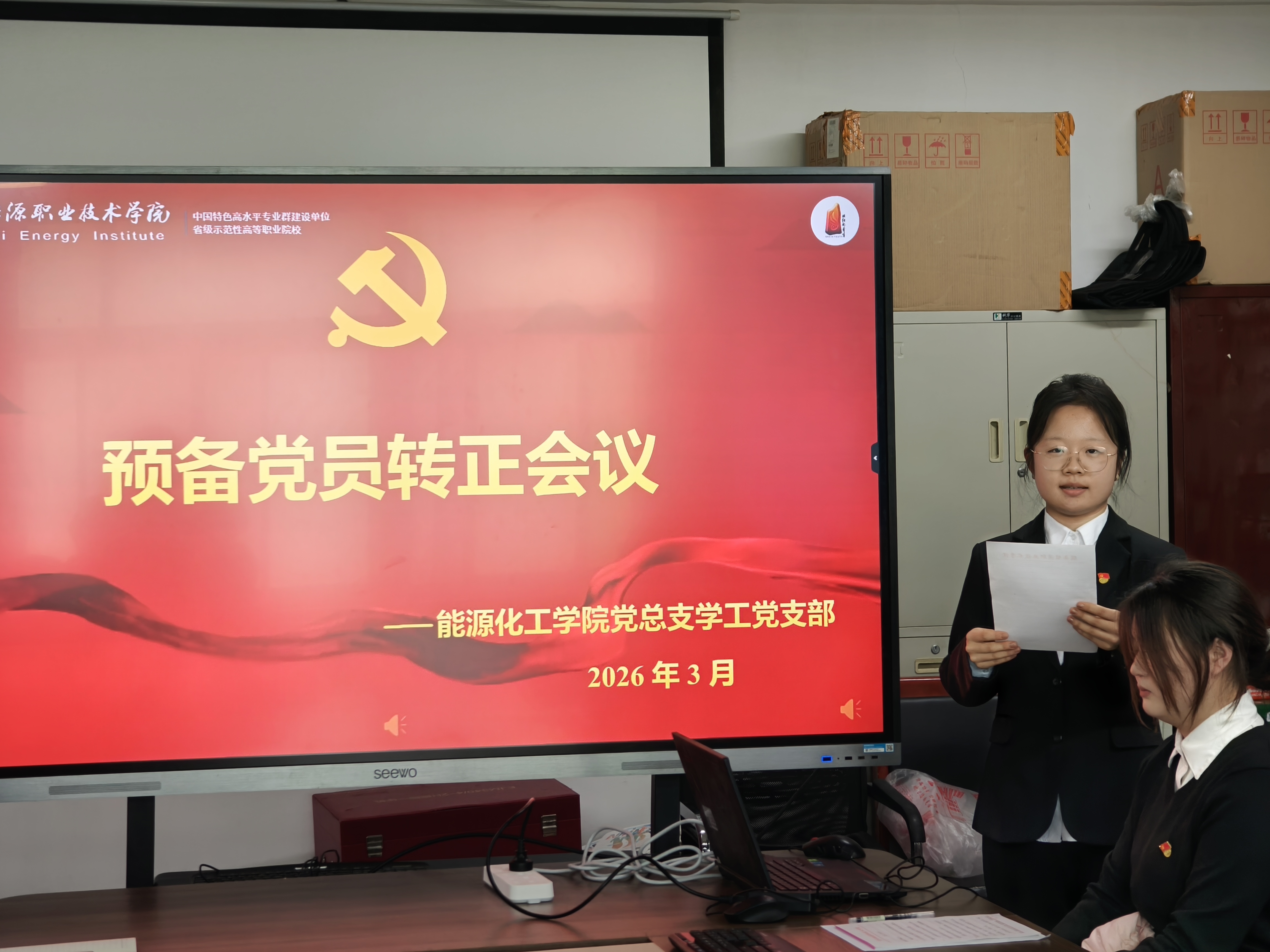 会议在庄严的国歌声中拉开序幕,全体参会党员起立奏唱国歌,浓厚的党性教育氛围贯穿始终,让在场每一位学生党员接受了深刻的思想洗礼。会议严格遵循《中国共产党发展党员工作细则》相关规定,流程规范、严谨有序。首先,学生预备党员依次郑重宣读转正申请书,围绕预备期内的思想成长、学业钻研、志愿服务、班级工作履职等方面进行详细汇报,结合能源化工专业学习特点,分享了理论学习与专业实践结合的收获,深刻剖析自身在理论学习深度、服务同学实效、专业能力提升等方面的不足,明确后续改进方向,并郑重表达了加入中国共产党正式党员的坚定决心与青春担当。