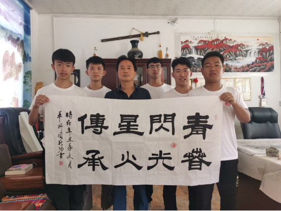 作为国家一级书法家,同新功写得一手好字。最后,实践队员们前往同新功老师家中欣赏其书法作品。纵观他的书法作品使人感到雄浑古朴、大气磅礴。临别,同新功现场挥毫泼墨,书写暑期社会实践队名“青春闪光 星火传承”赠予团队。