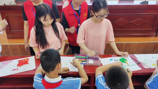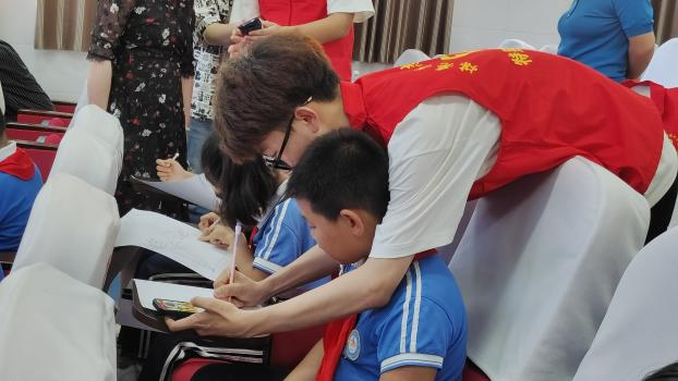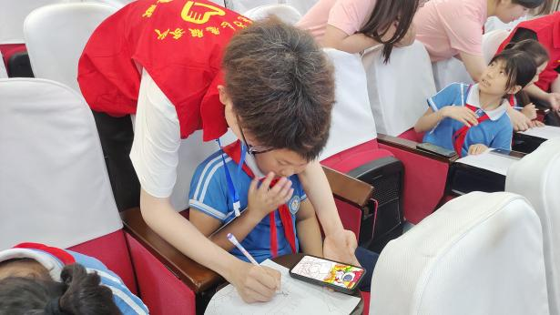 活动开始,志愿者们发放作画工具,并引导同学们大胆勾勒、以手绘心,用一支支五彩斑斓的画笔创作心中“党的红色印记”,他们用奇思妙想构思出了美妙的世界。每一幅作品都独具风格,有的构图大胆,对比鲜明;有的活泼可爱,色彩明丽;有的画风时尚,柔韧有余,展现出小画家细腻的心思与大胆的想象,表达了他们对绘画艺术的热爱之情以及对党、对祖国的热爱与对未来的畅想。