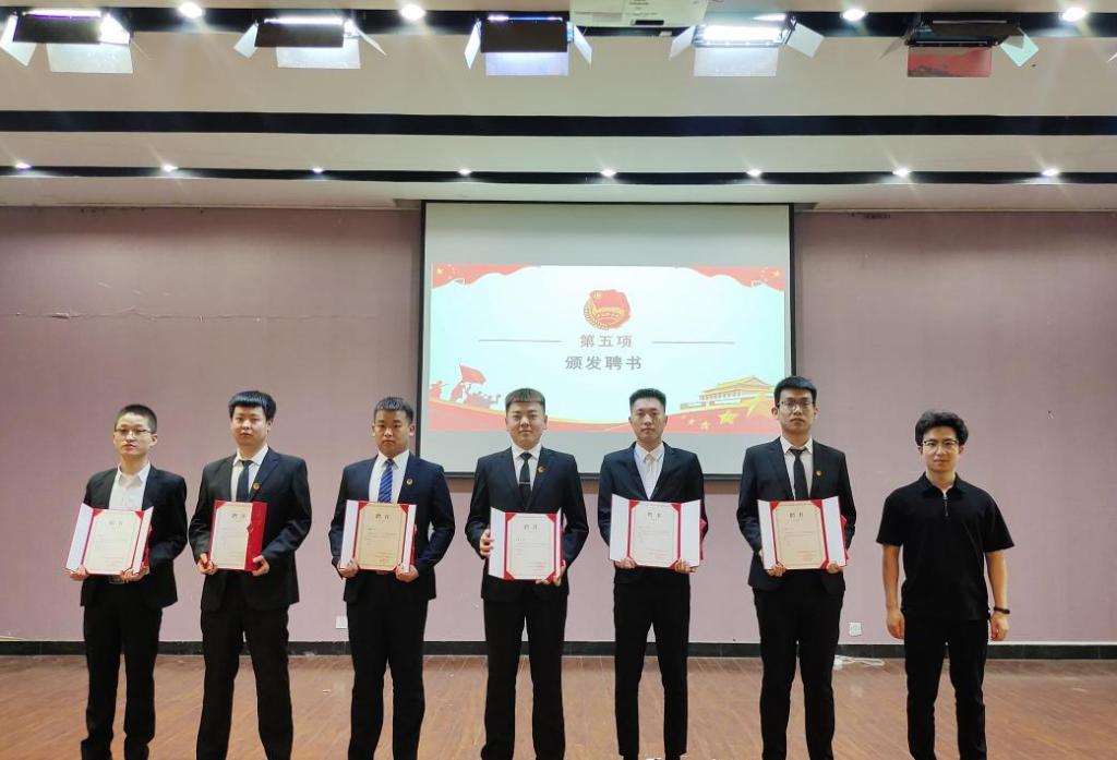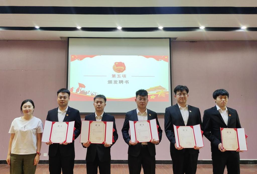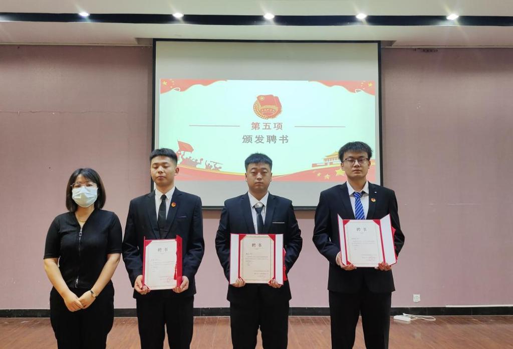 分团委指导老师徐靓、辅导员王栋、蒋文向第二届学生干部颁发聘书。