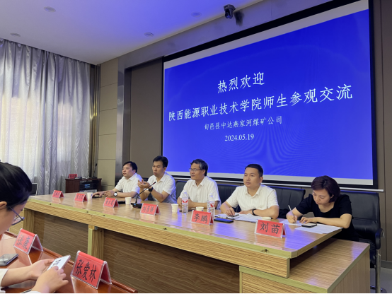 随后在会议室双方就深化校企合作进行座谈会,董永建矿长对陕能院师生的到来表达了热烈欢迎,并围绕企业用人需求、人才培养方案、企业文化建设等多个方面详细介绍了旬邑县中达燕家河煤矿公司的基本情况。刘彦锋介绍了学校招生、就业、校企的基本情况,并简要说明了学校的办学特色、行业优势,及煤化学院的基本情况。紧接着优秀企业校友与同学们进行了深刻的讨论,对同学提出的问题进行了详细解答。
