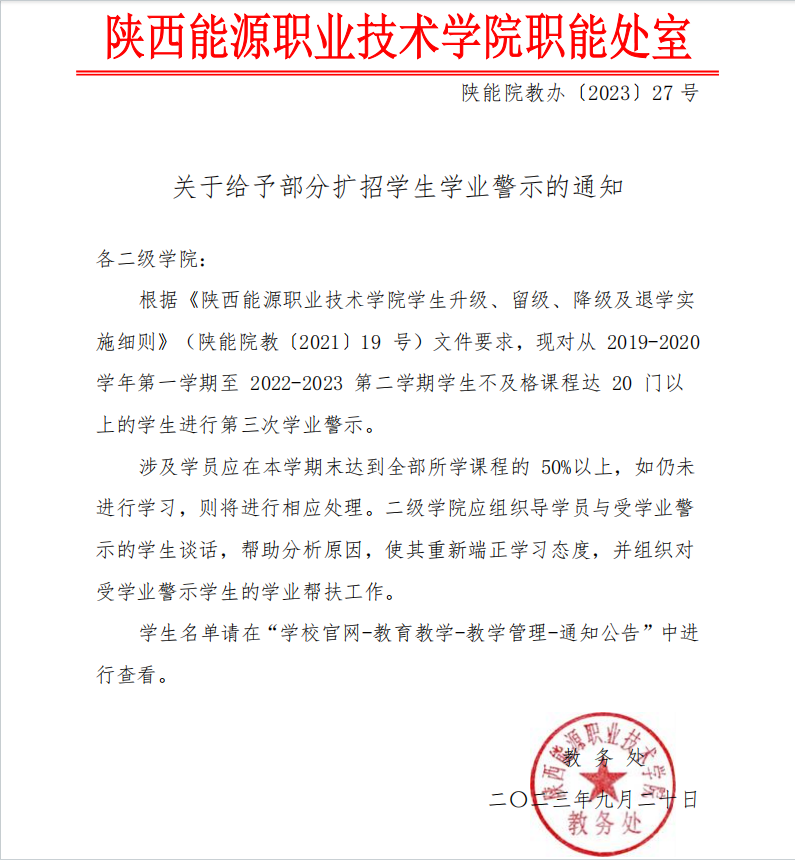 根据《陕西能源职业技术学院学生升级、留级、降级及退学实施细则》 (陕能院教 (2021) 19 号) 文件要求,现对从 2019-2020学年第一学期至 2022-2023 第二学期学生不及格课程达 20 门以上的学生进行第三次学业警示。
