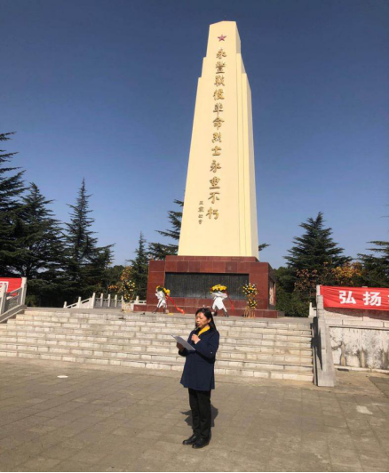 教学党总支宣传委员董莉莉老师在烈士纪念碑前向大家讲解了永丰战役那段辉煌的历史和张富清老英雄的先进事迹,让党员们感受到了老英雄不怕牺牲,勇敢战斗、不较个人荣辱,甘心为党和人民的伟大事业奋斗前行的奉献精神。