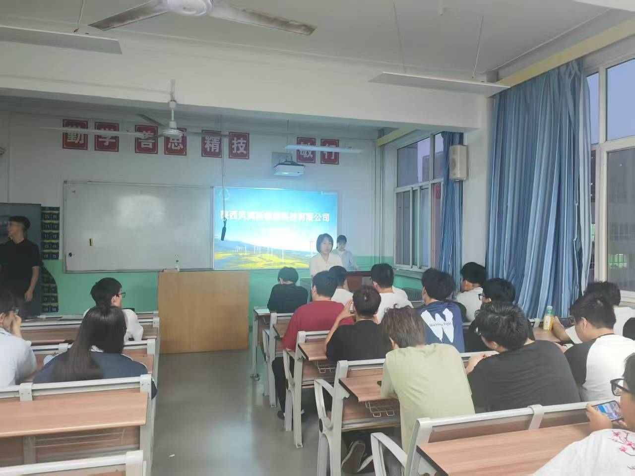 宣讲会上,风润新能源的企业代表首先详细介绍了公司的发展历程、核心业务以及在风力发电、光伏储能等新能源领域的技术优势与战略布局。随后,人力资源部门专家聚焦当前就业市场,为同学们带来了极具实用价值的面试技巧分享,从简历制作、自我介绍到应答策略,进行了全面而深入的剖析,赢得了在场学生的阵阵掌声。
