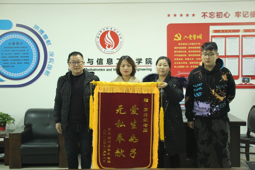 2019年11月25日上午,机信学院电气1801班学生刘智勇家长将一面绣着“爱生如子、无私奉献”字样的锦旗送给了班主任罗丹妮老师,以此感谢学校、老师对学生无微不至的照顾和关怀,这牵出了一段感人的师生故事。