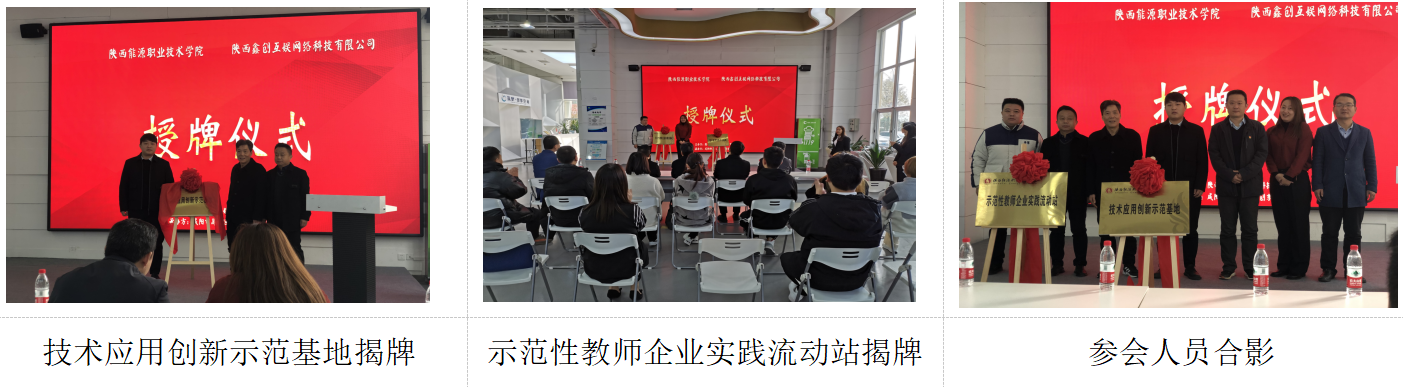 黄昆龙、侯秋冬、张阳阳共同为“技术应用创新示范基地”揭牌;陈强、杨鑫月共同为“示范性教师企业实践流动站”揭牌。