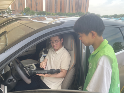 活动现场,学生们分组协作,运用专业设备对车辆进行精细化清洁。外观清洗环节,采用环保清洁剂与高压水枪,确保高效去污的同时减少水资源浪费;发动机舱除尘利用高压气枪工具,避免新能源车电路系统受损。活动现场,增加了动力电池故障诊断模块,柳剑刚教师指导学生利用智能诊断仪等工具,完成5辆车的深度检测,排除安全隐患。