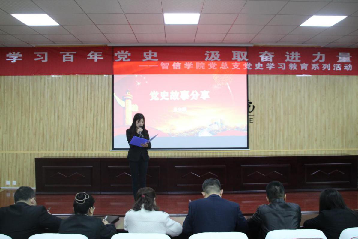 为庆祝中国共产党成立100周年,深入学习贯彻习近平新时代中国特色社会主义思想和党的十九大精神,引导全体党员学史明理、学史增信、学史崇德、学史力行,提高组织的凝聚力、战斗力、号召力和创造力,3月21日智信学院党总支在办公楼四楼文林大讲堂开展以”学习百年党史 汲取奋进力量“为主题的党史学习教育系列活动。